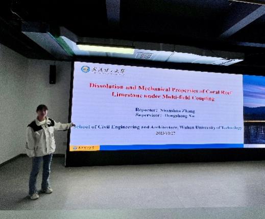 第一场报告由博士研究生章珊珊主讲,题目为“多场耦合下珊瑚礁石灰岩的溶解和力学性质”,重点介绍了珊瑚礁灰岩在不同溶液性质、温度和压力下在饱和CO2溶液中的溶解行为,以更深入地了解其溶解特性。同时,她介绍了在多场耦合作用下进一步研究珊瑚礁灰岩力学性能的试验方案。