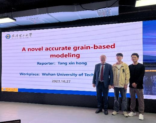硕士研究生唐新鸿以一种新颖的基于颗粒的精确建模为主题进行了报告,介绍了一种针对礁灰岩材料的小尺度建模方法。他表示后面的研究将重点解决该模型的两个主要问题:孔隙处的变形将很大使计算很容易中止以及如何合理考虑模型的边界效应。