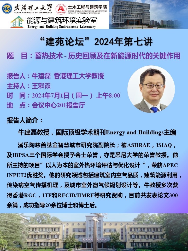 2024年7月1日,香港理工大学牛建磊教授应九州娱乐app 建环系副主任王彩霞博士邀请来我校讲学。上午8:00,在西院会议中心201报告厅,牛建磊教授为我校师生做了题为“蓄热技术-历史回顾及在新能源时代的关键应用”的学术报告。学术报告会由九州娱乐app 王彩霞老师主持,我校九州娱乐app 文远高教授、吴永佳教授、陈琼、严天、周希霖、刘梦阳博士等青年教师以及来自九州娱乐app 、材料科学与工程学院、信息工程学院、化学化工与生命科学学院等的百余位研究生和本科生参加了学术报告会。