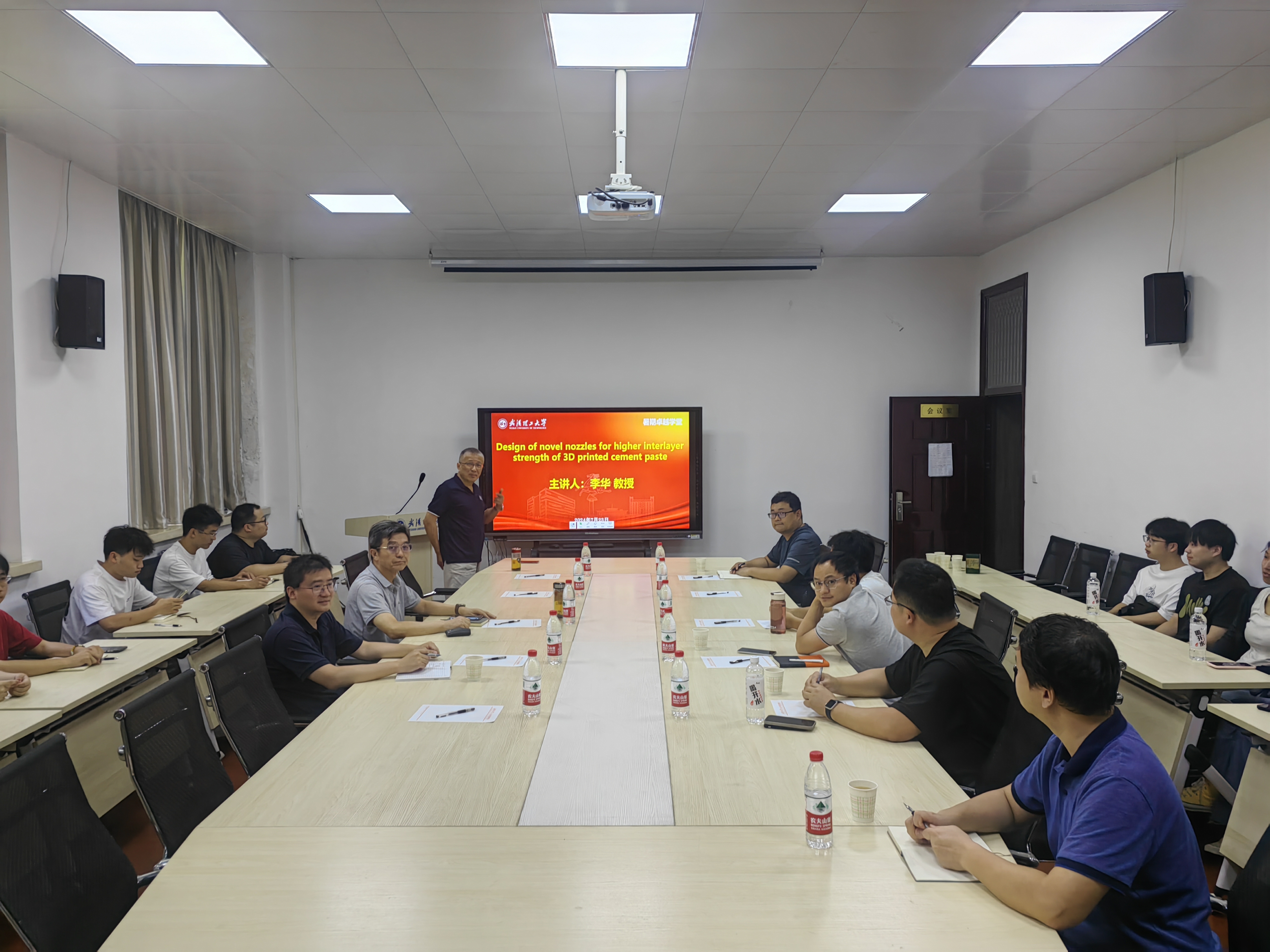离校前,723日上午李教授应邀再次为我校部分师生作了一场精彩的学术报告。李教授报告题目是:“Design of novel nozzles for higher interlayer strength of 3D printed cement paste(提高3D打印水泥浆体层间强度的新型喷嘴设计)”。报告会由刘沐宇教授主持。