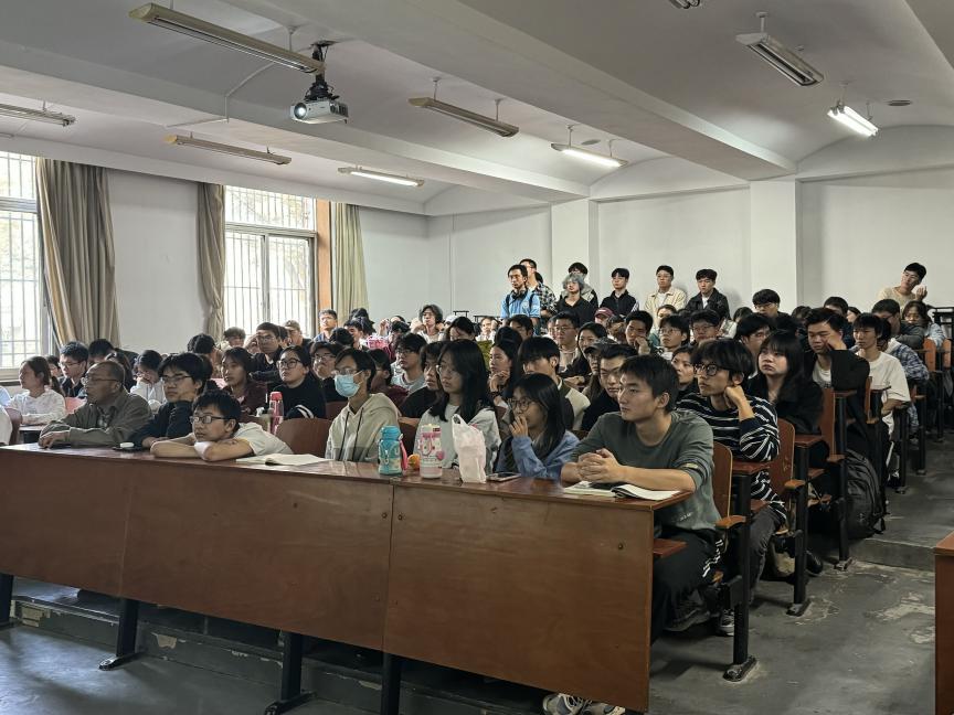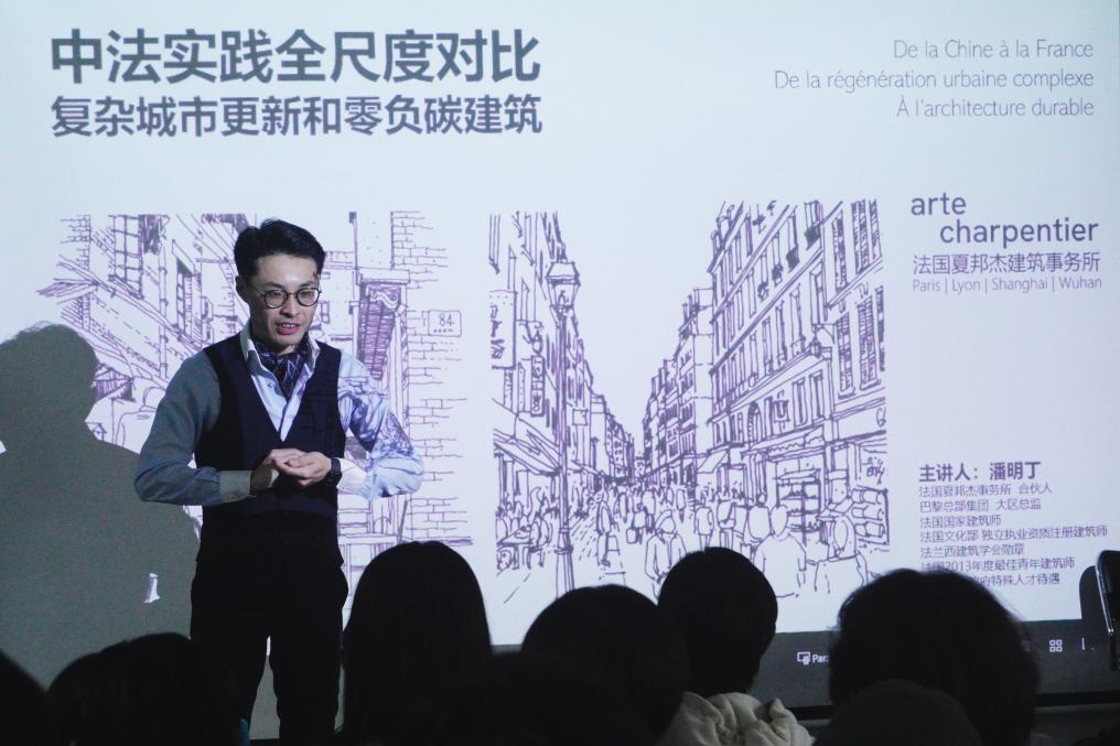 讲座中,潘明丁通过武汉·蔡甸中法生态城等项目案例,分享了城市更新与生态建筑的前沿实践与理念,并以实例深入比较了中法两国的城市更新模式的异同。潘明丁表示,生态城市建设应顺应自然,通过“低技术”设计减少人工干预和能源消耗,以合理设计解决内涝等问题,实现人与自然的和谐共生。他鼓励同学们在职业生涯中保持多元视角和独立思考,积极关注生态环保,投身于绿色建筑实践。