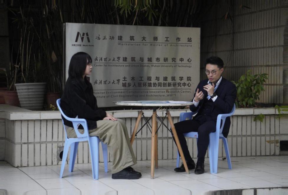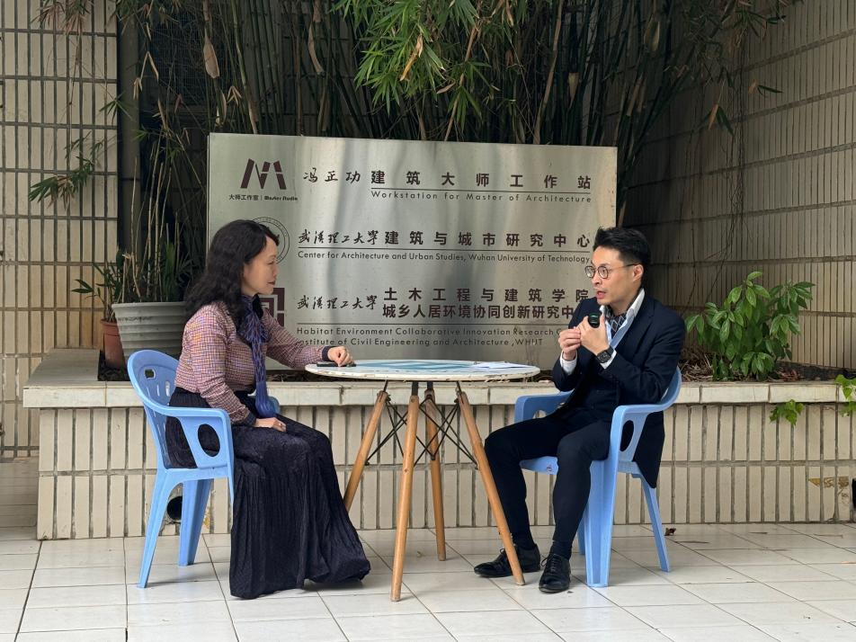 会后,在珞樱楼前,陈剑宇老师同研会宣传部记者魏思雨同学对潘明丁校友进行了专访。访谈中,潘明丁解答了关于中法历史文化街区保护的不同方法等问题。潘明丁还指出,随着人工智能等技术的兴起,建筑学未来更需关注人性,智慧城市的建设应以人文和自然为核心。