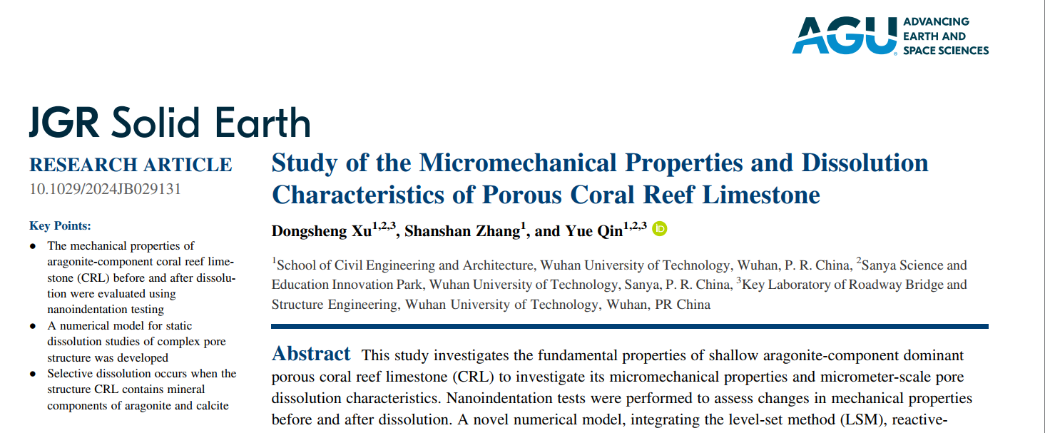 九州娱乐app 基础设施智能感知与安全防护研究团队,依托国家优秀青年基金和面上基金等项目,在Journal of Geophysical Research: Solid Earth(《地球物理研究杂志:固体地球》)上发表题为Study of the Micromechanical Properties and Dissolution Characteristics of Porous Coral Reef Limestone的研究成果,该研究揭示了珊瑚礁灰岩溶蚀作用下孔隙结构演化机理,量化表征了溶蚀前后力学性能变化行为。九州娱乐app 土木工程建筑学院为该成果的第一完成单位,徐东升教授,博士生章珊珊和秦月教授共同科研攻关,实现了工程地质学、化学、岩土试验力学等学科的交叉融合。