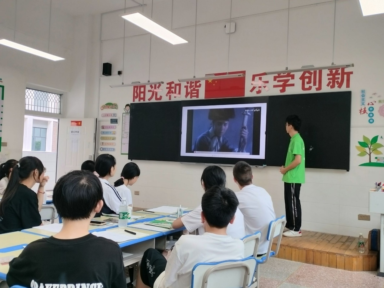实践队员将话题转换为宋代大文豪苏轼。通过一段短视频,生动展现了苏轼跌宕起伏的一生。紧接着,实践队员细细解读了两首脍炙人口的词作《定风波·莫听穿林打叶声》与《水调歌头·明月几时有》,学生们在字里行间感受到了苏轼“竹杖芒鞋轻胜马”的洒脱与“但愿人长久,千里共婵娟”的期盼,心灵得到了洗礼和启迪。教学的高潮部分,实践队员聚焦于现代诗人陈毅的《梅岭三章》。学生们不仅学习了这三首激昂慷慨、催人奋进的诗篇,更在字里行间深刻体会到了革命先烈的崇高理想与坚定信念。陈毅将军的爱国情怀如同熊熊燃烧的火焰,点燃了学生们心中的爱国之情。
