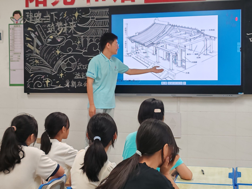 “同学们,你们知道什么是古建筑吗?它们不仅仅是我们祖先用石头、木头堆砌而成的房子,更是我们中华民族悠久历史和灿烂文化的见证与象征。”课堂伊始,学生们立即被实践队员的开场白所吸引,开始认真倾听实践队员的授课内容。接下来,实践队员通过播放视频、介绍中国古建筑的历史背景、对古建筑结构进行拆分讲解等方式,让学生们对中国古建筑的发展历史以及结构设计有了初步的了解。
