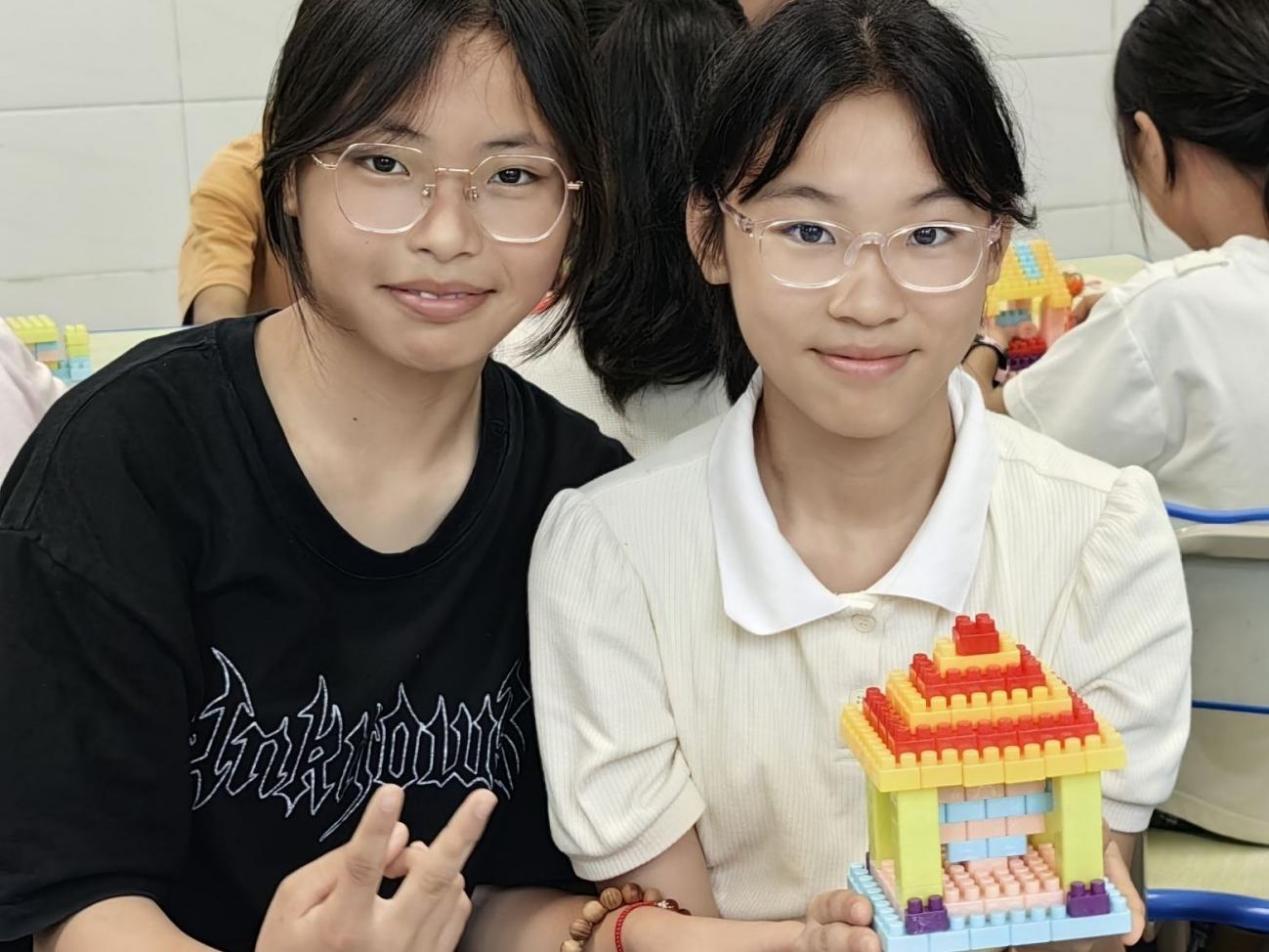 为了让学生们更加直观地感受古建筑的魅力,实践队员们带来了各种颜色的乐高积木,邀请他们分组合作,根据本节课所学的古建筑知识,尝试搭建自己心目中的古建筑模型。学生们都能够巧妙地利用不同颜色和形状的积木,让自己搭建的建筑看起来既坚固又美观。经过一个多小时的努力,学生们的作品纷纷出炉。虽然这些模型略显稚嫩,但每一块积木都凝聚了他们的心血与汗水,每一个细节都透露出他们对古建筑的热爱与敬畏。